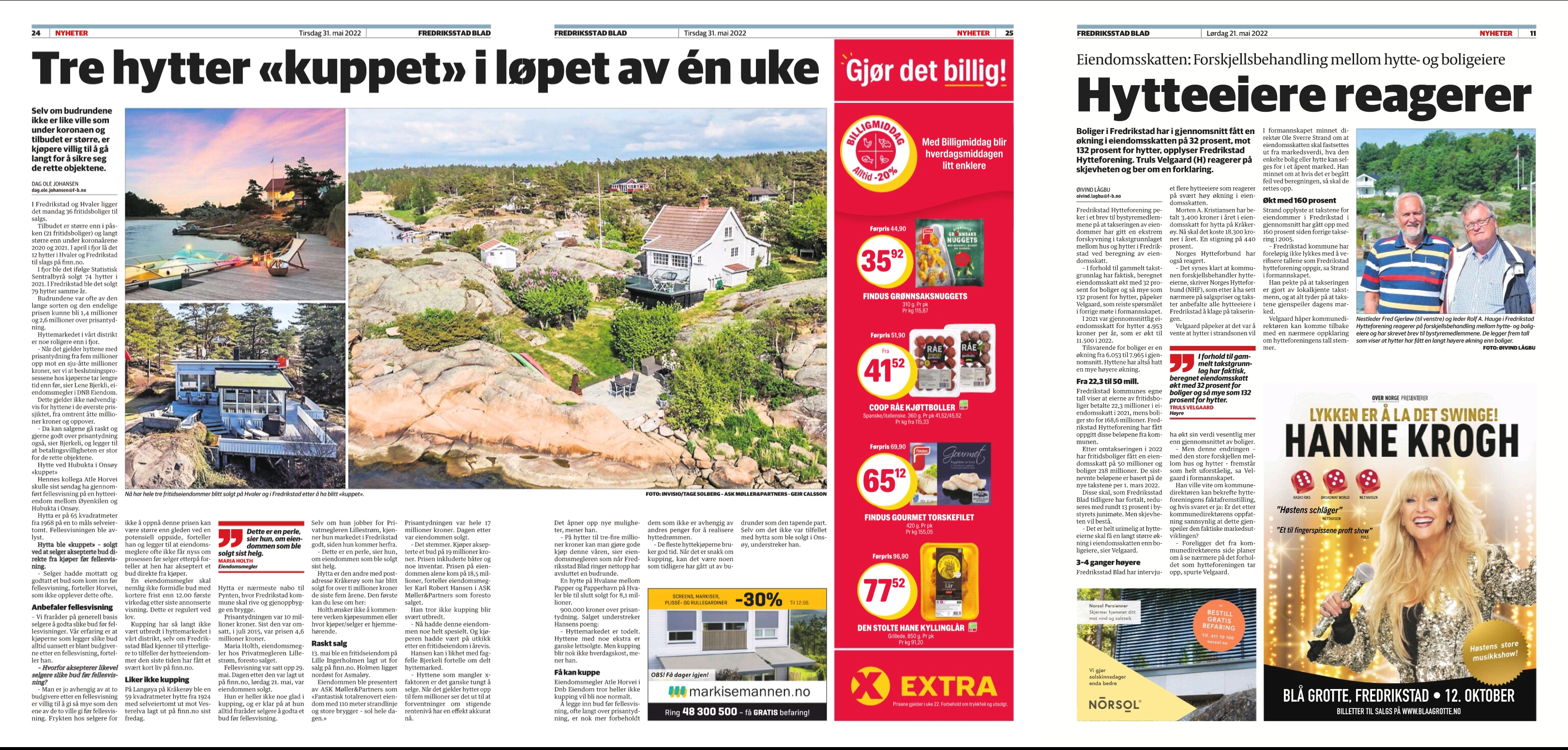 Like før sommerferien 16.juni endret bystyret promillesatsen fra 3,4 til 3,1 promille for å justere den totale eiendomsskatten fra 369 millioner kroner til budsjettert 325 millioner kr. Et skritt i riktig retning, men Fredrikstad Hytteforening mener at dagens tomtetakst er satt for høyt for hytter. Her har kommunen kun fokusert på avstand til sjøen, og ikke gradert i soner som for hus. Dette gjenspeiler seg i meget høye takster og dermed høy eiendomsskatt. Eiendomsskatt for hytter var 50 millioner kr for 2022 mot 22,3 millioner i 2021, mer enn en fordobling.